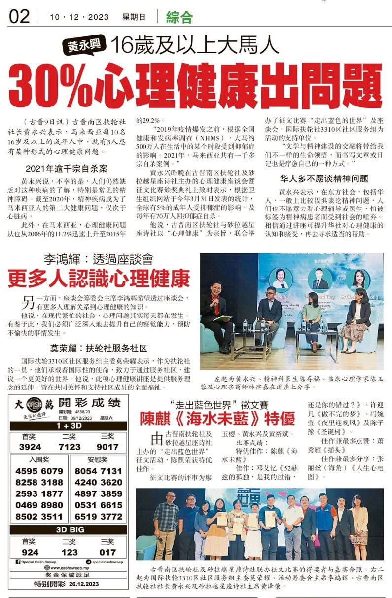 Thank you Rotary Club of Kuching South for the invitation extended to our counselor, Ms Lim Re Gal, and the organization of the creative exchange of ideas in psychology and literature. The discussion was facilitated by the moderator's humor and enriched by the professional and friendly sharing of the panelists. The key points discussed during the forum are summarized as follows: