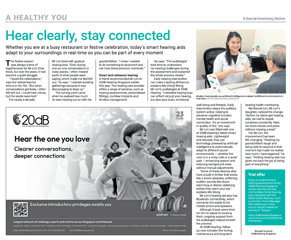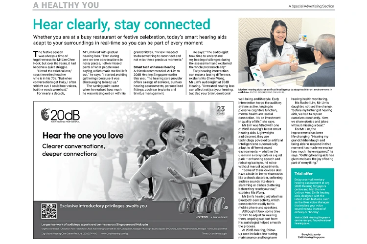 Early hearing intervention can make a lasting difference, explains Ms Cheryl Wong, Mr Lim’s audiologist at 20dB Hearing. “Untreated hearing loss can affect not just your hearing, but also your brain, emotional, well-being and lifestyle. Early intervention keeps the auditory system active, helping to preserve cognitive function, mental health and social connection. It’s an investment in quality of life,” she says.